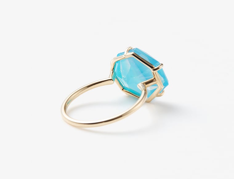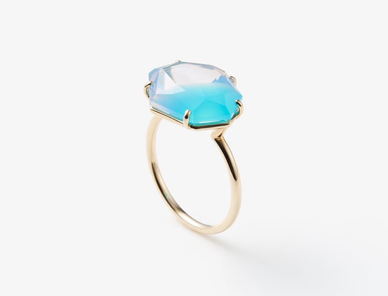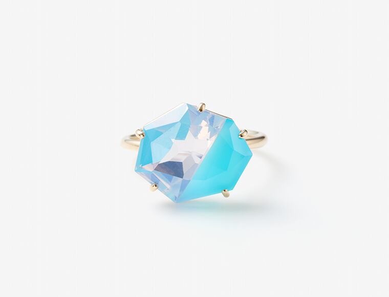 手磨りのランダムなオリジナルカットが美しく映えるリング。コーディネートの差し色に、クールな存在感を示します。